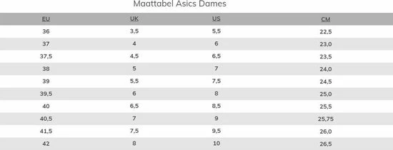 - Pasvorm: standaard breedtemaat/ Asics sportschoenen vallen klein, advies om een maat groter te bestellen