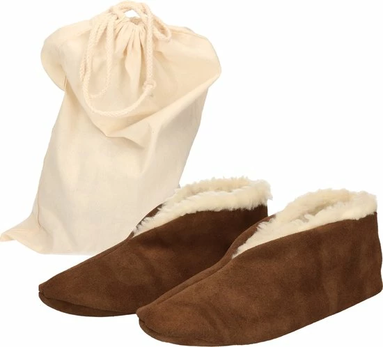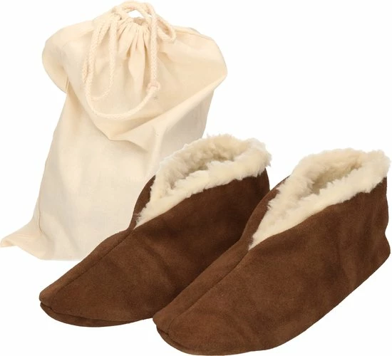 Bruine Spaanse sloffen/pantoffels van echt leer/suede voor dames/heren maat 44 met handige opbergzak. Deze Spaanse sloffen zijn gemaakt van 100% echt suede/leer en zijn afkomstig uit Spanje. De sloffen komen met een handige opbergzak. Er wordt geadviseerd 1 maat groter dan je schoenmaat te kiezen. De sloffen lopen enigszins uit. Kleur: Bruin. Maat: 44. Materiaal buitenkant: Echt leer/suede. Binnenvoering: 20% wol, 80% acryl. Land van afkomst: Spanje.