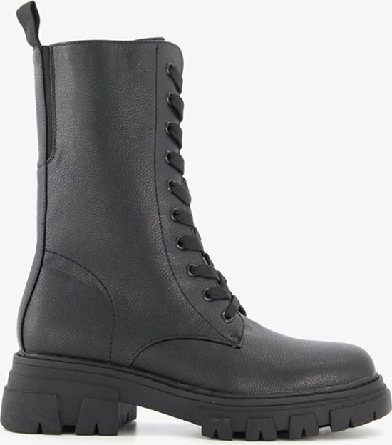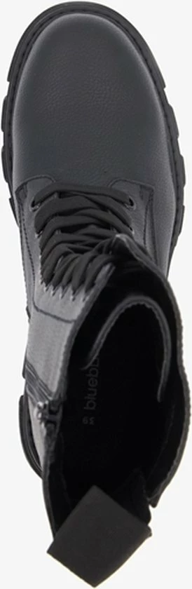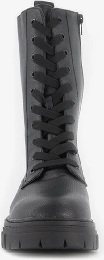 Zwarte dames veterboots uit de Blue Box collectie. Gemaakt van imitatieleer, een binnenwerk van imitatieleer en een stevige zool. De boots zijn voorzien van vetersluiting, hebben een rits aan de binnenzijde en een aantreklusje op de hak. De binnenzool is gemaakt imitatieleer, deze is niet uitneembaar. De schachthoogte van de laarzen is 23 cm en de hakhoogte