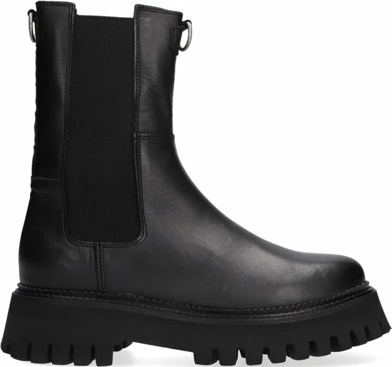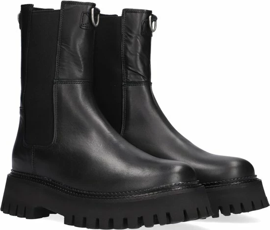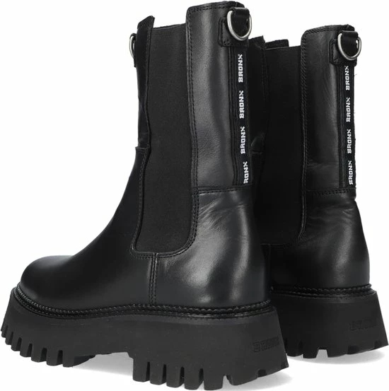 Het avontuurlijke merk Bronx weet de catwalk designs te vertalen naar fAshionable streetwear voor de vrouw die er graag zelfverzekerd bij wilt lopen. Deze lichtgewicht hoge chelsea boot Groov-Y 47268 is uitgevoerd in zwart glad leer met comfortabele elastische zijpanelen. Op de voor- en achterkant van de schacht bevinden zich zilverkleurige halve ringen en de hiel is voorzien van een textiel tape met logo opdruk. Opvallend is de drievoudige zoolrand met verschillende kartelrandjes. Doordat de zool gemaakt is van microrubber is hij licht van gewicht wat fijn aanvoelt en zorgt voor een hoge demping. Het grove profiel zorgt niet alleen voor die extra stoere touch maar ook een goede en stevige grip. Dankzij de elastische zijpanelen ervaar je een ruime instap en een prettig loopcomfort. Daarnaast accentueert de slanke en aansluitende schacht de mooie vorm van jouw been! Het binnenwerk heeft een leren voering met een vast voetbed. De dikke plateauzool is bijna 5 cm dik. De schacht is 19 centimeter hoog met een wijdte van 26 centimeter aan de bovenkant.