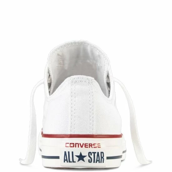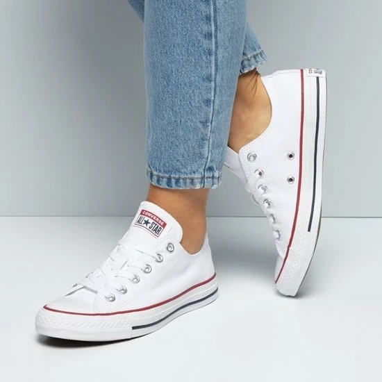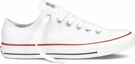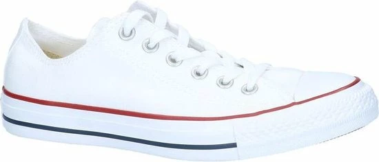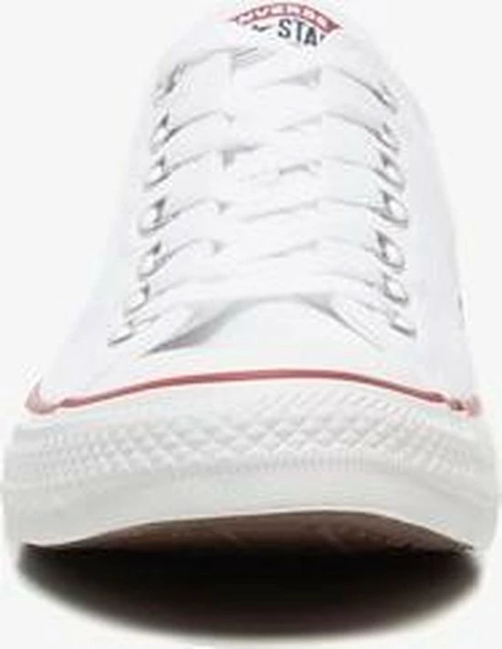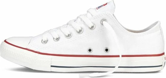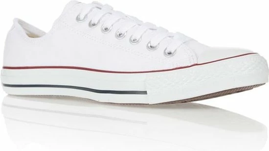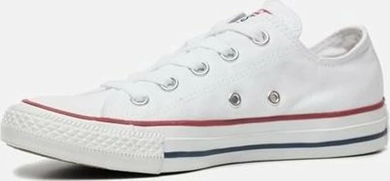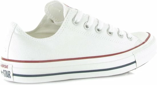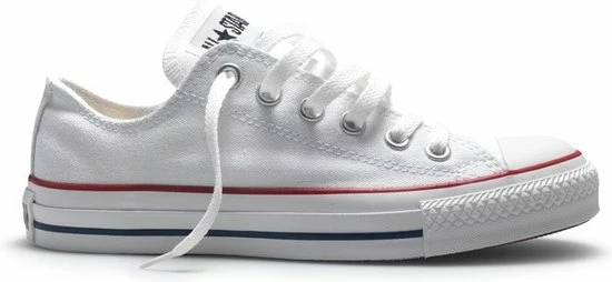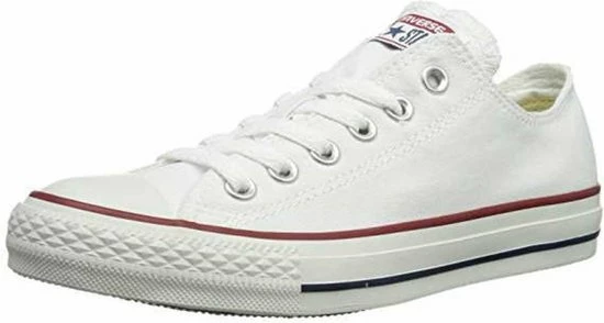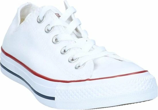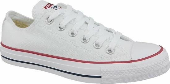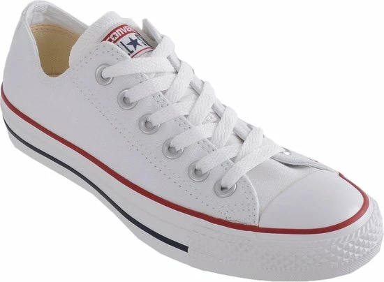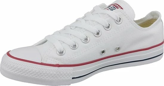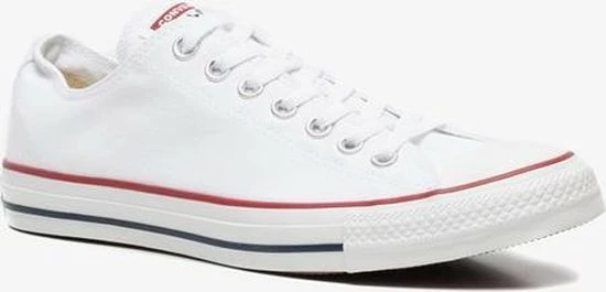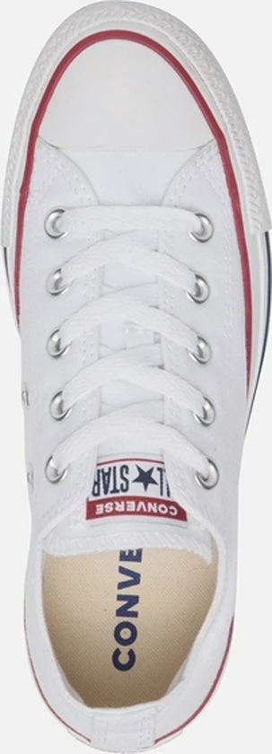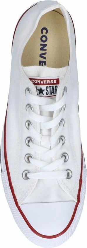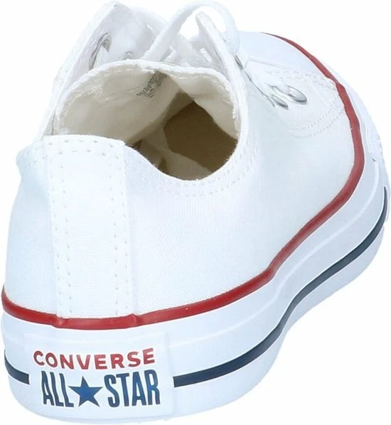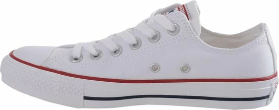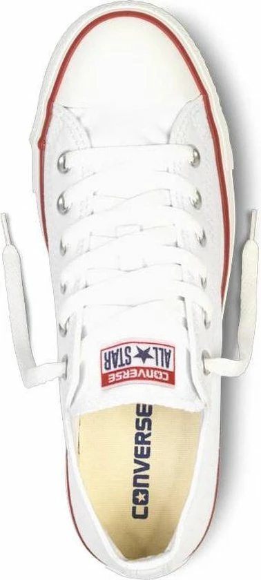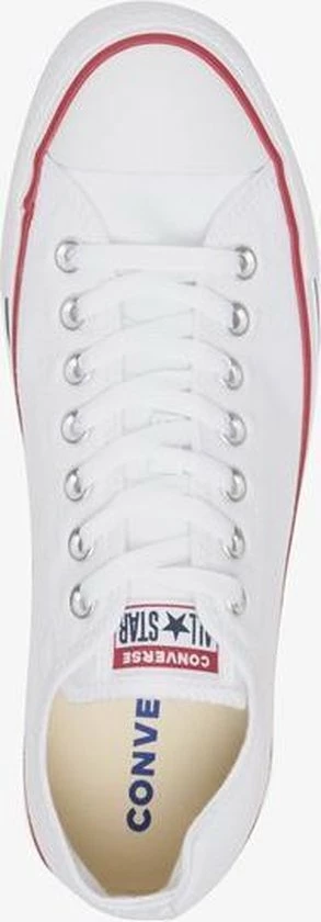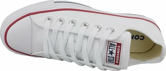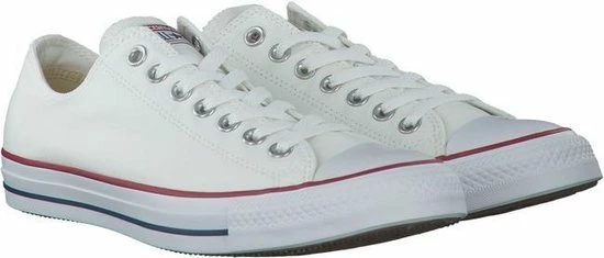 Witte Chuck Taylor All star OX Low Top sneakers gemaakt van canvas, met een voering en binnenzool van textiel. De klassieke sneakers zijn uitgevoerd in het lage model dat net onder de enkel valt. De sneakers zijn voorzien van merkopdrukken, stiksels en een rode en blauwe lijn over de rubberen zool met dikte van 2 centimeter. Door middel van veters zijn de sneakers te sluiten. Het voetbed van de Low top Chuck Taylor All Star OX sneakers is niet uitneembaar.
