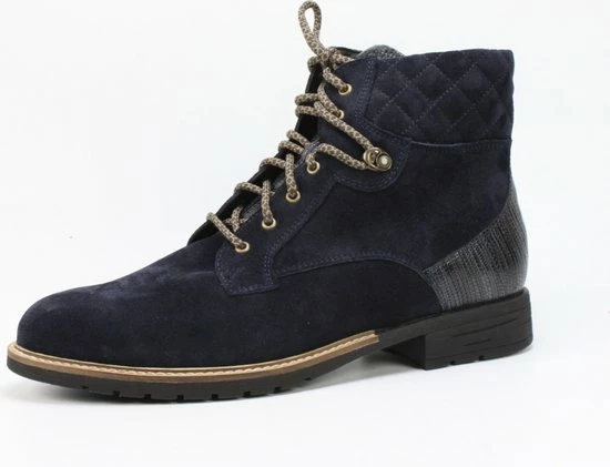 Enkellaarsje van Durea in donkerblauw suede met op de hiel een leren inzetstuk met print en om de enkel een gewatteerde rand met ruitmotief. De boot staat op een zwarte rubber profielzool met op de zoolrand een bruine leren rand met contraststiksels. Artikel 9731 765 0134 heeft naast een ronde gemeleerde veter, geregen door metalen veterringetjes en 2 hikingsluitingen een rits aan de buitenzijde van de voet. De sportieve boot is leergevoerd, voorzien van een uitneembaar voetbed en het betreft een H-leest, geschikt voor de bredere voet.