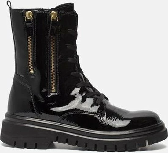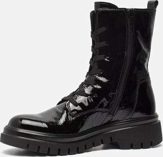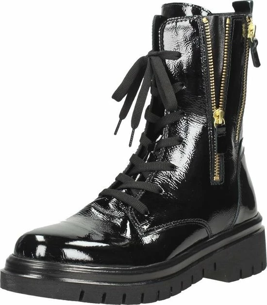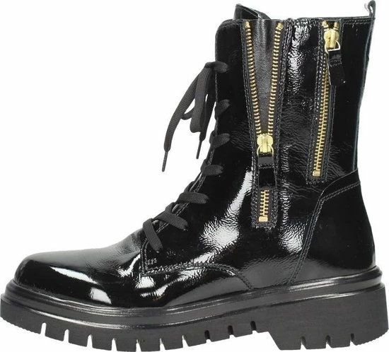 Deze stoere Gabor biker boots in het zwart zijn gemaakt van lak. De voering is gemaakt van textiel en de binnenzool van synthetisch materiaal. Ter decoratie zijn er sierstiksels en twee gouden sierritsen aangebracht. Door middel van een rits in combinatie met de veters en het lusje aan de achterkant trek je de boots gemakkelijk aan en uit. Omdat de biker boots zijn uitgevoerd in een F-leest, zijn ze geschikt voor smallere voeten. Het voetbed van deze zwarte Gabor biker boots is uitneembaar.