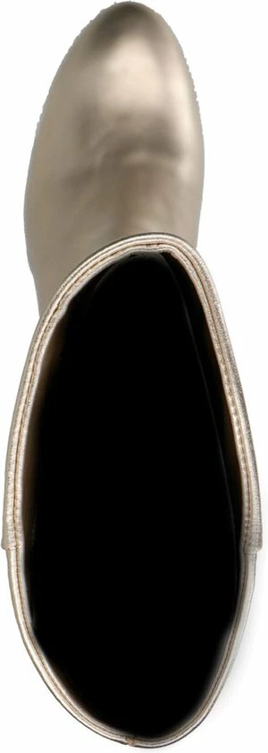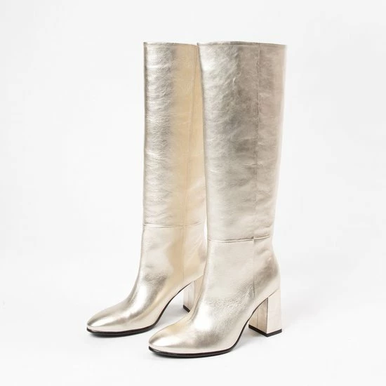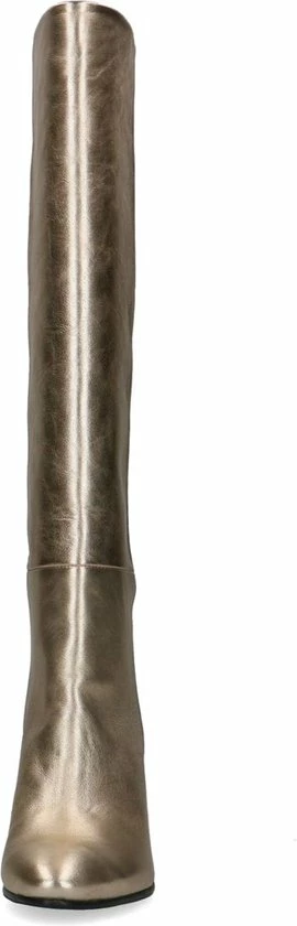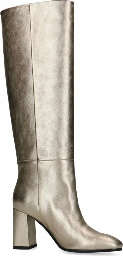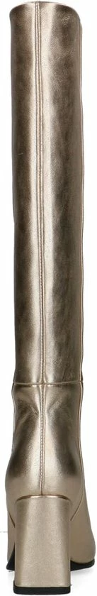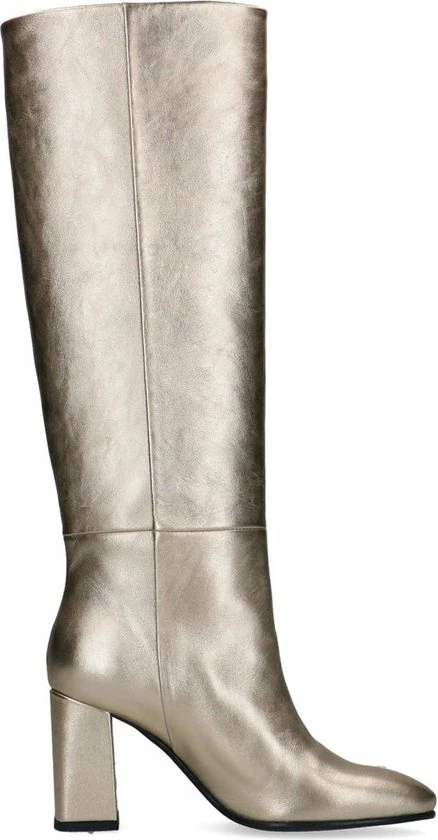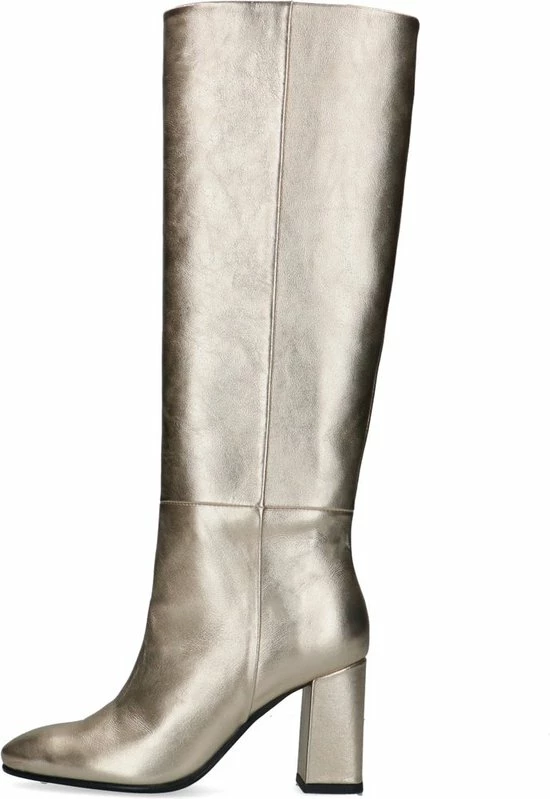 Goudkleurige leren hoge laarzen met hak van Manfield. Deze hoge laarzen zijn voorzien van een hak met hoogte van 8 cm. Deze hoge laarzen zijn gemaakt van leer. Om deze laarzen langdurig mooi te houden raden we je aan ze te verzorgen en beschermen met de Collonil Carbon Pro. De schacht heeft een hoogte van 43 cm en een omtrek van 37 cm.