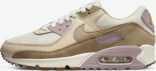 De Nike Air Max 90 in maat 37.5 is voor een gedempt en subtiel uiterlijk, bestaande uit een zeilgaasbasis naast lederen en suède overlays in een mix van tan-, beige- en bruintinten. Andere details zijn de roze contrasterende accenten overal, inclusief de branding. Een Sail-tussenzool en bruine rubberen buitenzool ronden de belangrijkste kenmerken van de sneaker af.