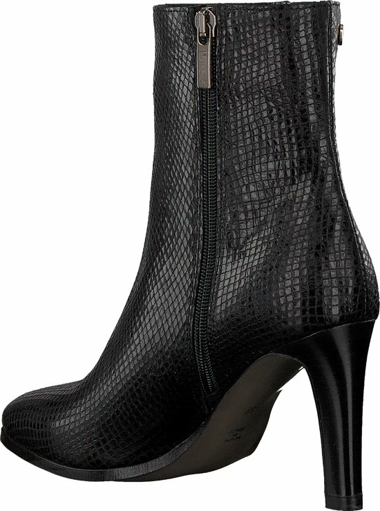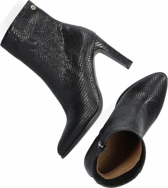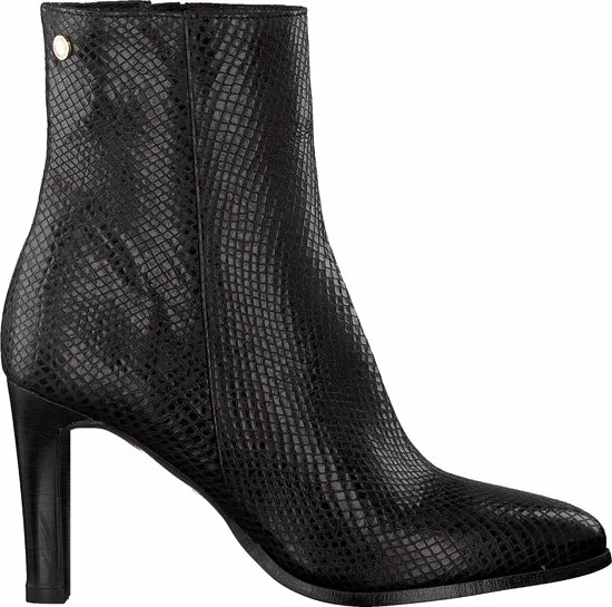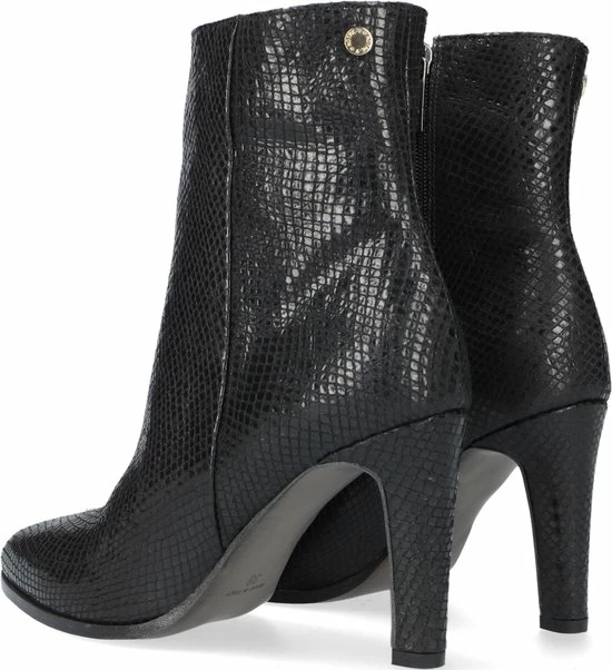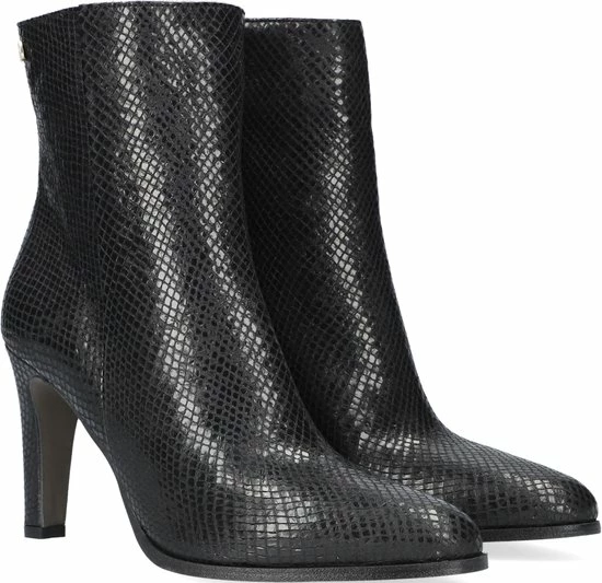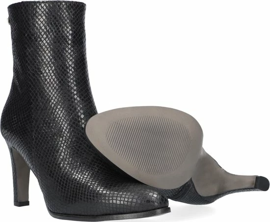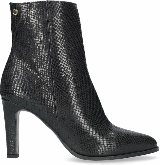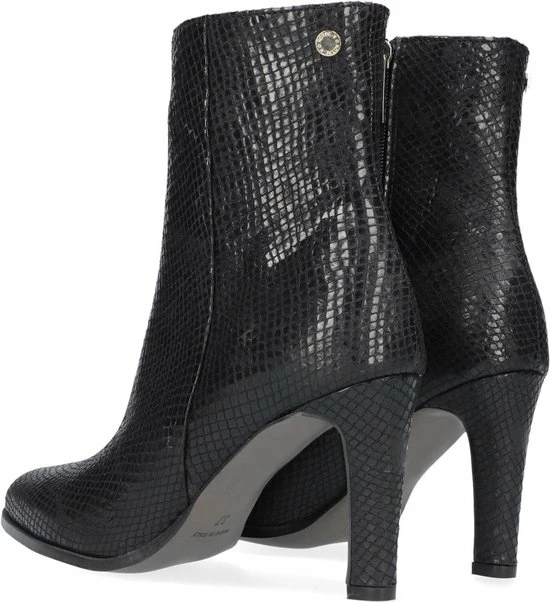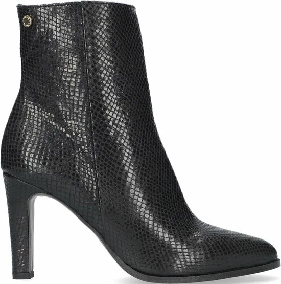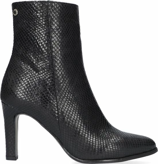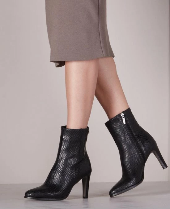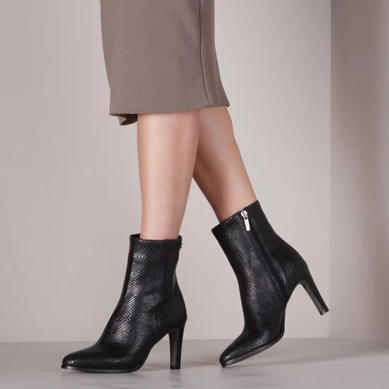 De elegante Italiaanse ontwerpen van het merk Notre-V zijn er voor de verfijnde vrouw die er graag effortless chic uit wil zien. De producten zijn gemaakt van luxe materialen met subtiele accenten en een knipoog naar de laatste trends. Dit zwarte ultrafeminin enkellaarsje 7436 is gemaakt van leer in een reptielprint en heeft een spitse neus en een smalle hak. De hak van zo’n 8 centimeter hoog benadrukt jouw vrouwelijkheid en laat je benen mooi uitkomen. De voering is gemaakt van leer en heeft een vast voetbed. Dankzij de ritssluiting aan de binnenzijde van de laars ervaar je veel gemak bij het aan- en uittrekken. Het fijne profiel onder de rubberen zool zorgt voor voldoende grip en stabiliteit, zodat jij zelfverzekerd naar al je afspraken loopt. Schachthoogte is 14 centimeter, gemeten bij maat 37.
