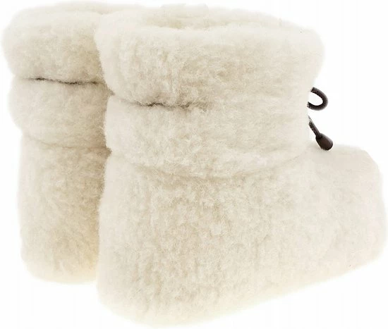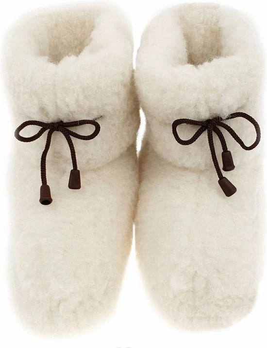 - Materiaal: 100% lamswol (buiten- en binnenkant) + echt leer (zool)