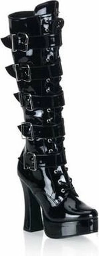 pleaser. Een zwarte laars met veters aan de voorkant en 5 riemen. Hak 5 inch = 12.7 cm.