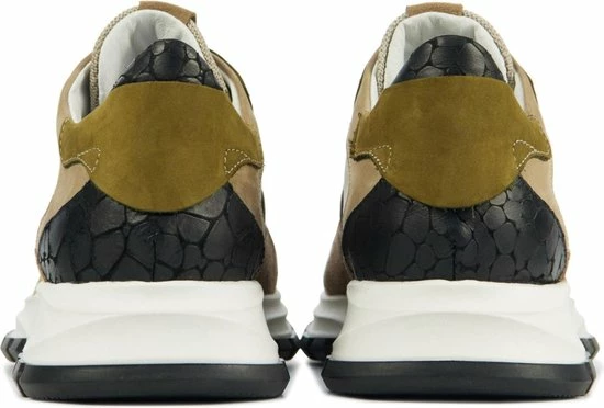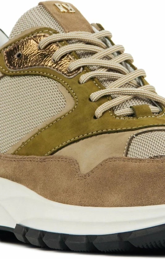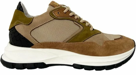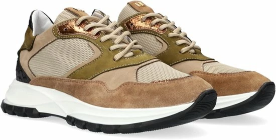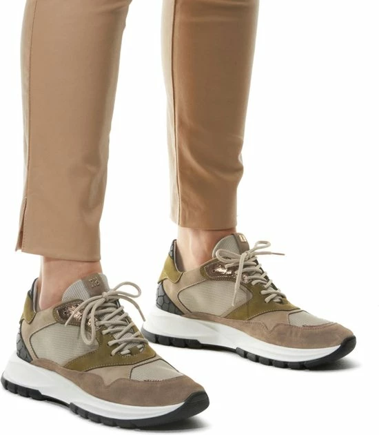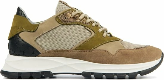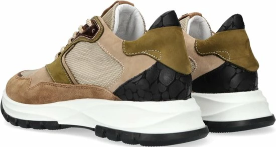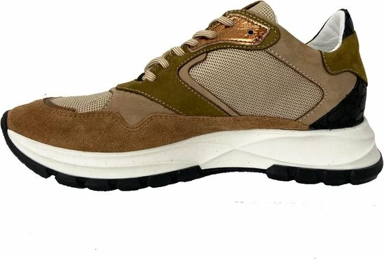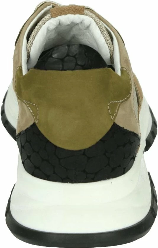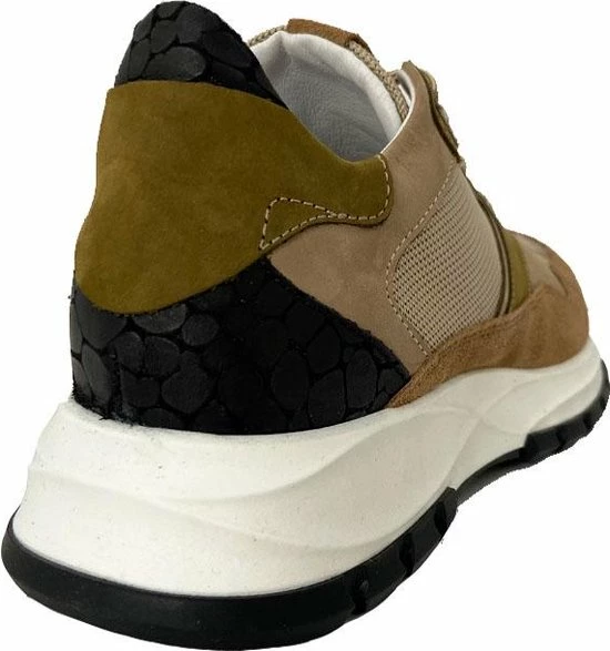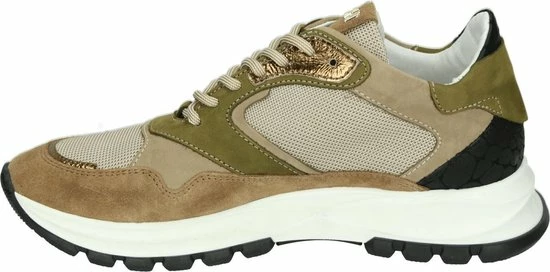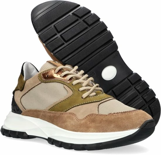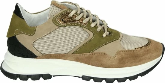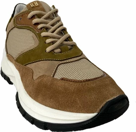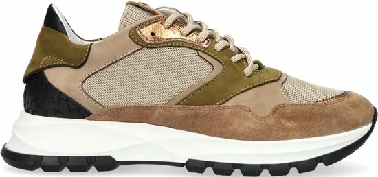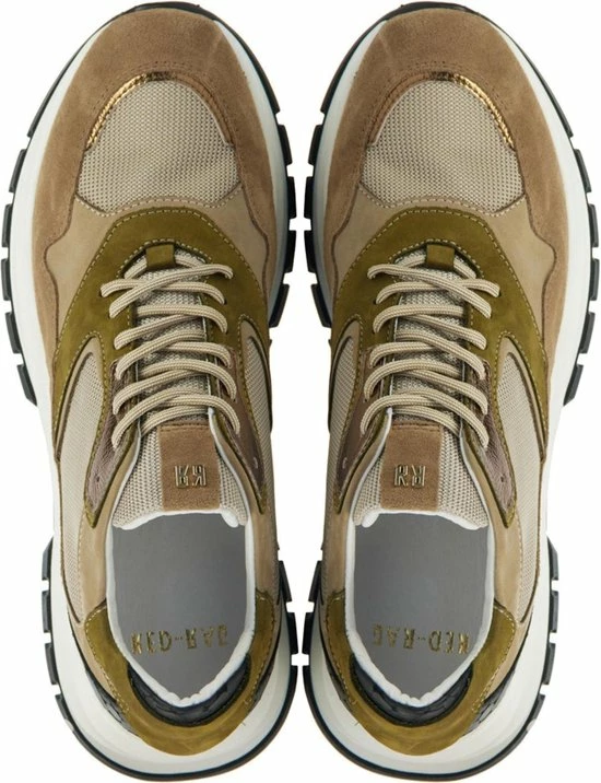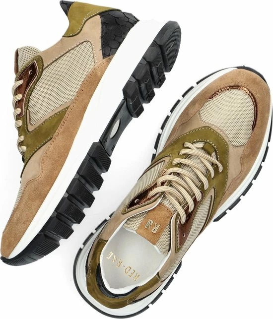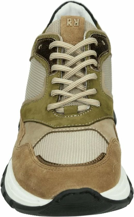 Lage gecombineerde sneaker voor dames van het merk Red Rag. Deze sneaker met ronde neus is uitgevoerd in de kleur beige gecombineerd. De schoen bevat zowel suède, leer als mesh in de kleuren beige,groen en zwart. De binnenkant is uitgevoerd in leer en een suède contrefort draagt bij aan het loopgemak. Het uitneembare voetbed is te vervangen door een persoonlijke inlegzool. De rubberen zool heeft een grof profiel voor stevige grip.