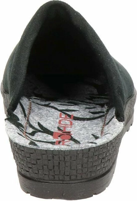 Zwarte Rohde pantoffels gemaakt van textiel, net zoals de comfortabele binnenzool en de voering. Ter decoratie zijn er stiksels en een printje en een merkopdruk op de binnenzool aangebracht. De rubberen zool van de zwarte pantoffels loopt bij de hak iets omhoog en heeft daar een dikte van 2 centimeter. De pantoffels zijn voorzien van een G leest, wat betekent dat ze normaal vallen.