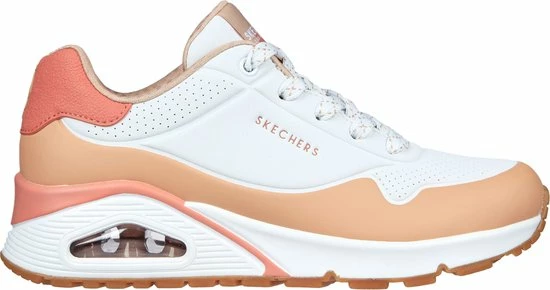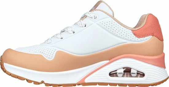 Skechers Uno Pop Color wit tan sneakers dames Skechers Street Uno dames sneaker. Een sportieve comfortabele sneaker dankzij de Air-Cooled Memory Foam binnenzool. Dit model is uitgevoerd in imitatieleer en voorzien van perforatie accenten op de neus. De binnen voering is van textiel. Het Air-Cooled Memory Foam voetbed zorgt ervoor dat de schoen ademend is en hoog comfort biedt. Voorzien van een rubberen profielzool met luchtkussens in de tussenzool. Kleur: wit, tanMateriaal bovenwerk: synthetisch