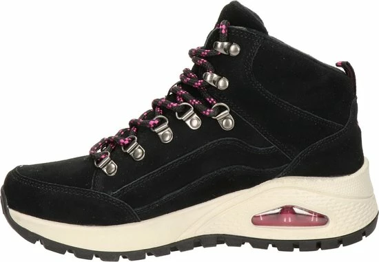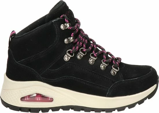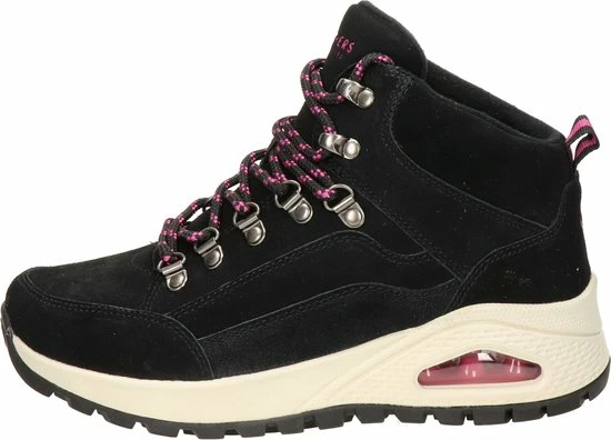 Deze zwarte Skechers Uno Rugged One veterboots zijn ideaal voor al jouw avonturen! De schoenen zijn gemaakt van suède en zijn voorzien van sierstiksels, opvallende roze veters en een lusje aan de achterkant. De schoenen zijn waterafstotend en houden je voeten dus heerlijk warm tijdens al je wandelingen. De binnenzool met Air-Cooled Memory Foam geeft demping tijdens het lopen voor extra comfort. De boots zijn voorzien van een verborgen sleehak met een hoogte van 2,5 centimeter. Deze Skechers Uno Rugged One veterboots hebben een rubberen profielzool die veel grip geeft.