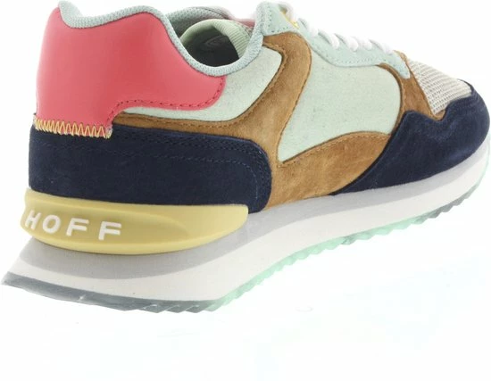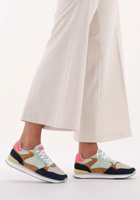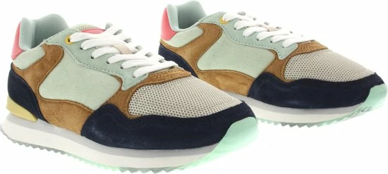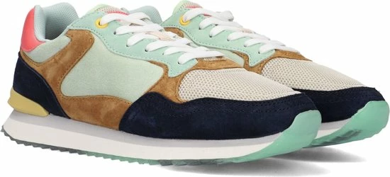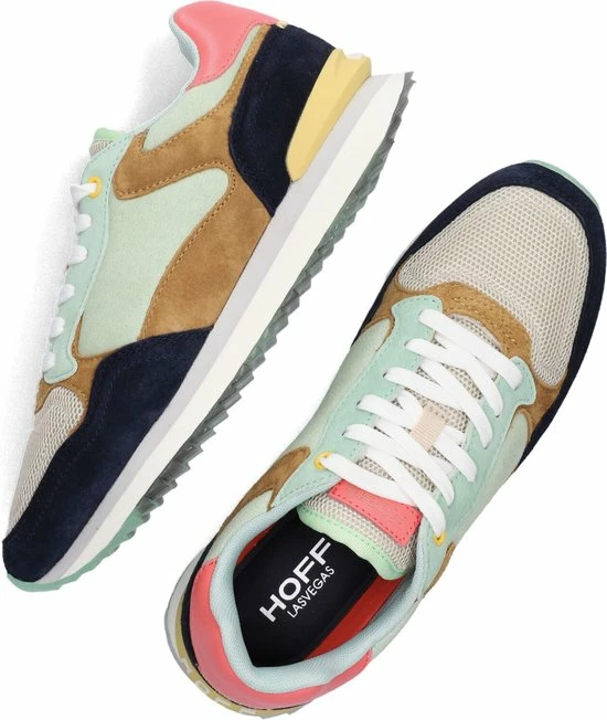 Deze lage LAS Vegas sneaker van THE Hoff Brand is een vrolijke verschijning in jouw schoenencollectie! De sneaker is gemaakt van lichtgroen suède met camelkleurige en donkerblauwe overlays. Ook bestaat de voorkant en tong uit grijs mesh. De sneaker heeft toffe details zoals het roze merkembleem op de tong, de gele hielstabilisator en witte veter. De binnenkant is van lichtgroen mesh en heeft een uitneembaar voetbed van memoryfoam. De rubberen tussenzool heeft een grijze accentstreep en de transparante loopzool heeft een gripvast profiel met een opvallende afbeelding van Las Vegas. Zet je sneakers in het middelpunt en combineer ze onder een stoere mom jeans.