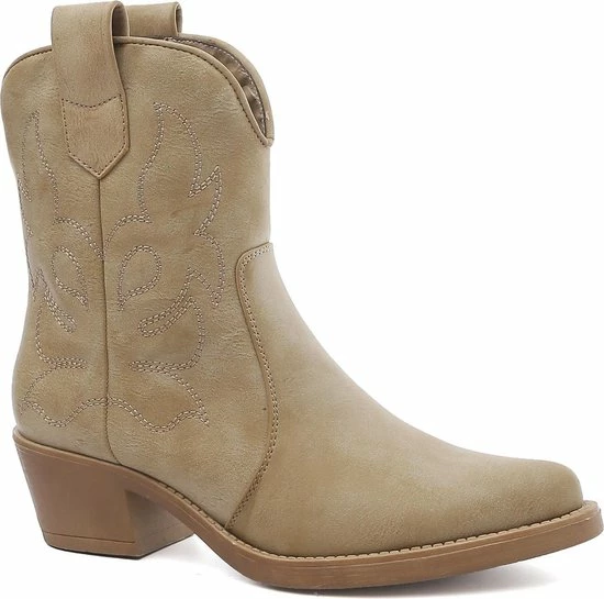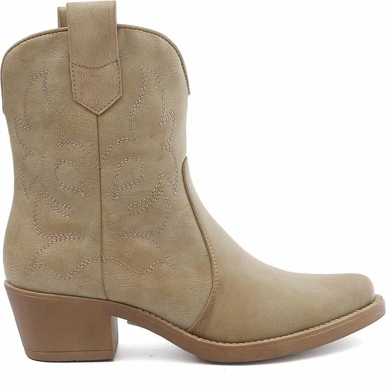 Taupe Khaki korte imitatieleren cowboylaarzen voor dames. Laarzen met stiksels afgewerkt met bruine zool. Verkrijgbaar in maat 36 t/m 41.