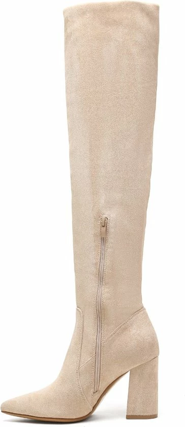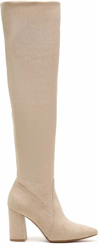 Musthave Beige Suedine overknee laarzen. Comfortabel en perfect aangesloten pasvorm. Verkrijgbaar in maat 36 t/m 41. Deze trendy laarzen maken je outfit helemaal af.